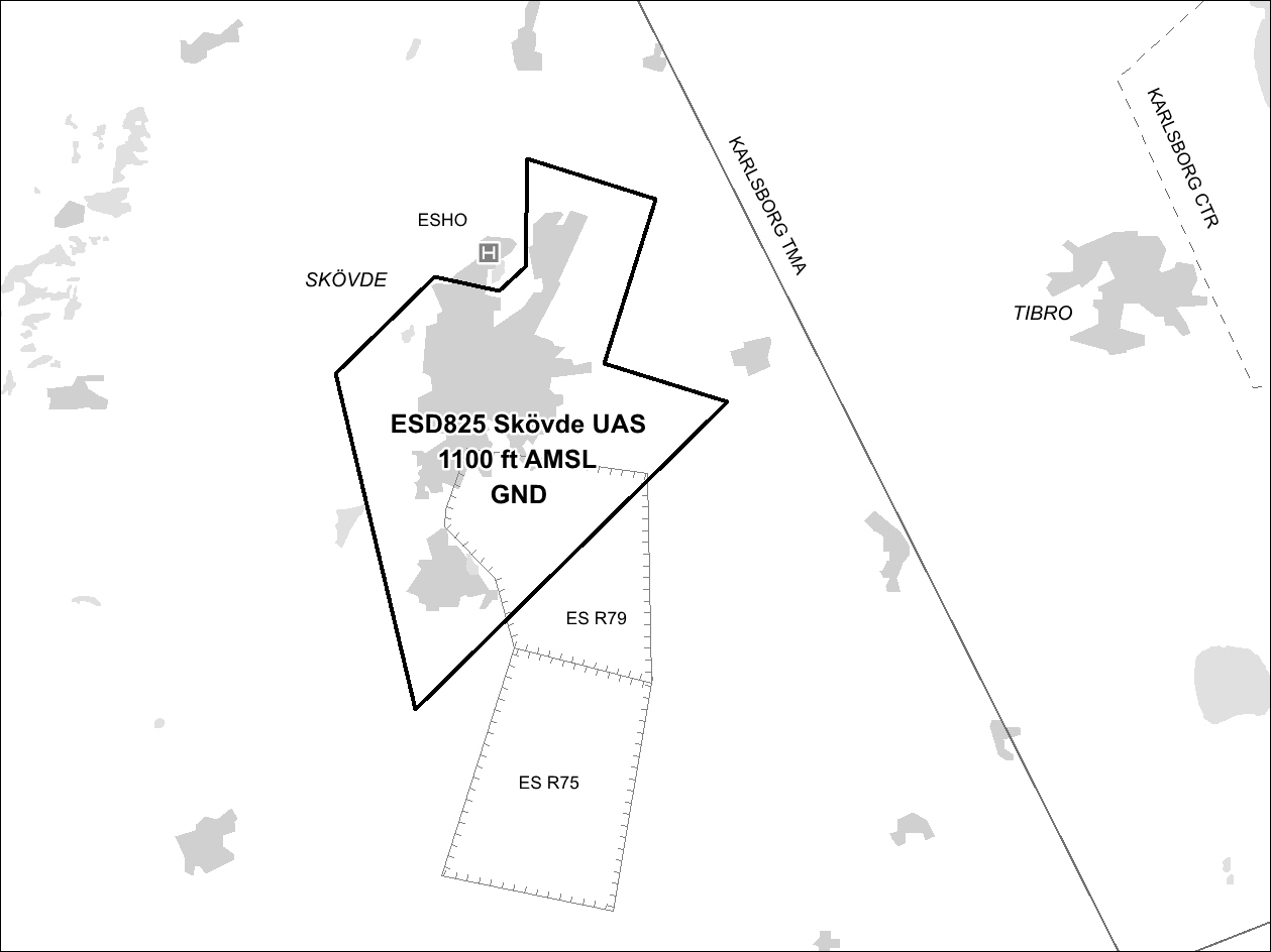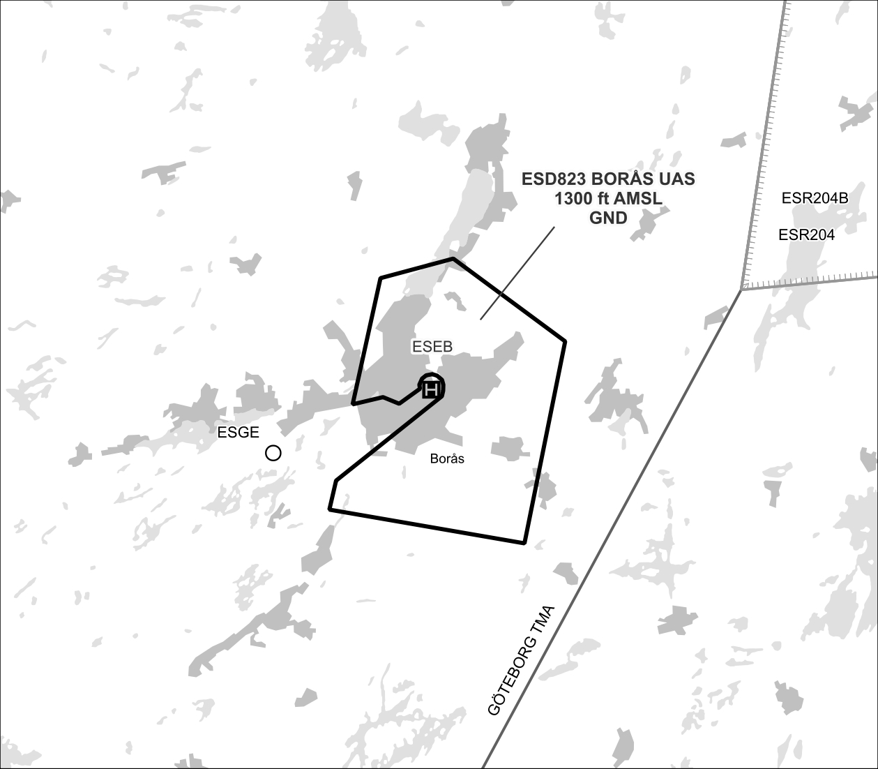 Temporary danger areas ESD823 Borås UAS, ESD824 Uddevalla UAS and ESD825 Skövde UAS are established for UAS flying beyond visual line of sight (BVLOS) with special permission.